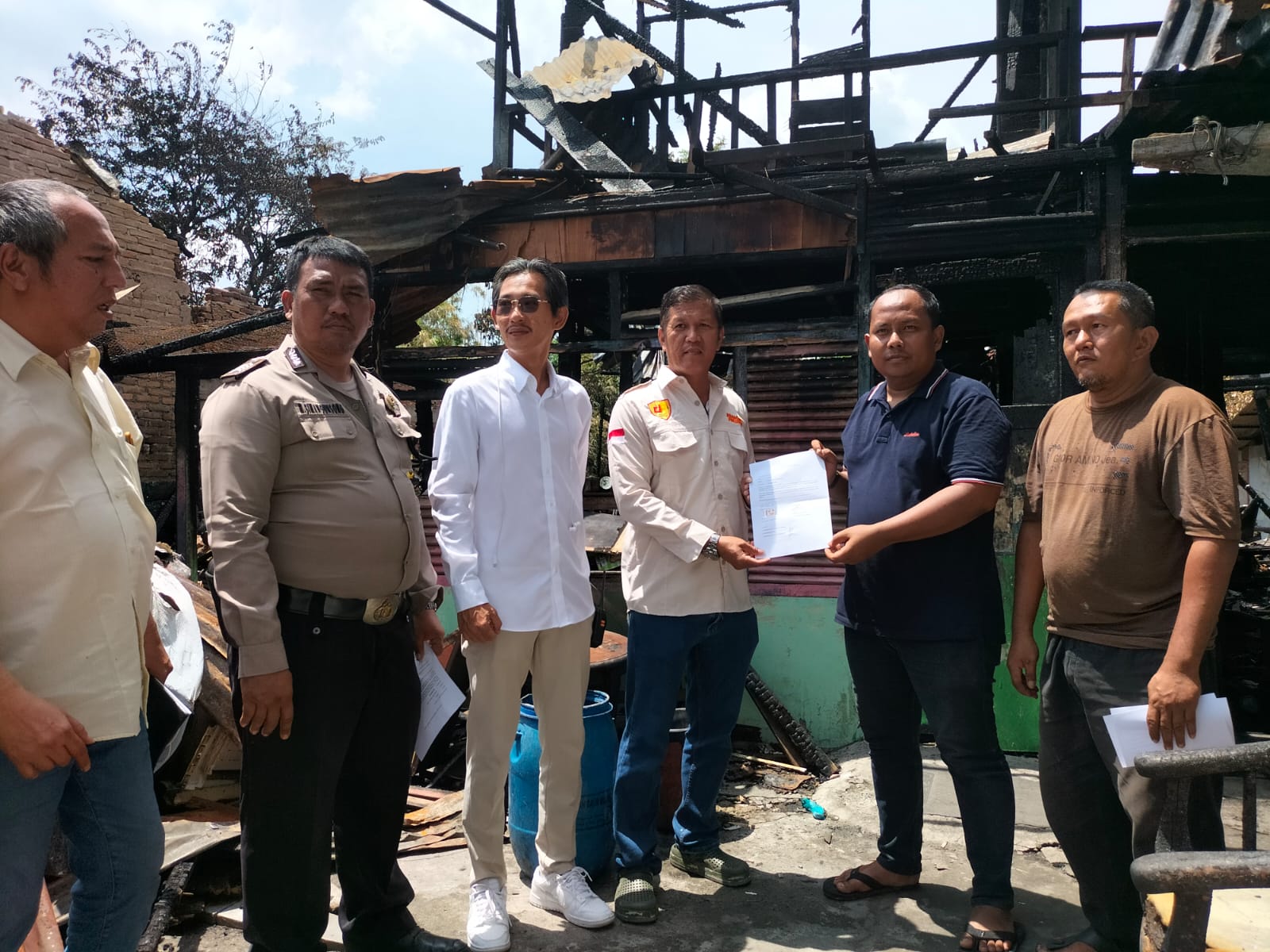 Relawan JP 08 datang untuk menyerahkan bantuan pakaian bekas kepada para korban. Dalam kesempatan itu, juga secara simbolis diserahkan 14 ribu bata.