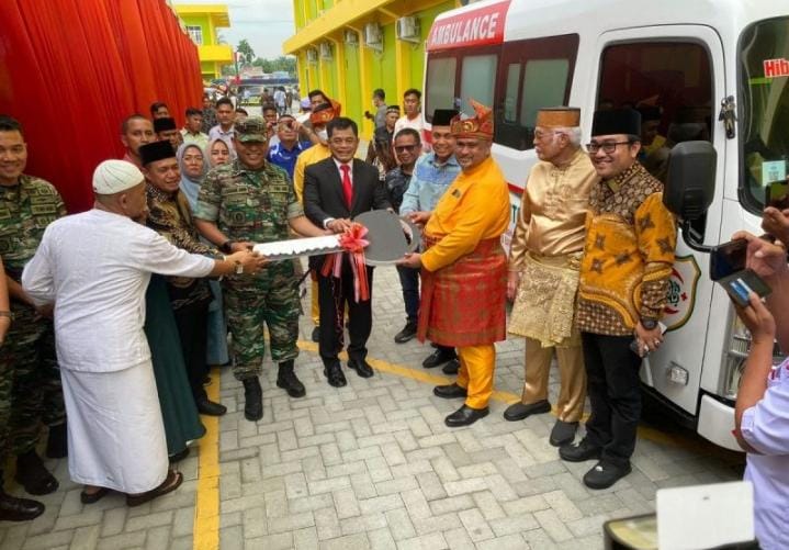 Pangdam I / BB Mayjen TNI H. Achmad Danil Chairdian SE M.Si menyerahkan kunci ambulan pada Dirut Utama RSU Bidadari disaksikan Bupati Batu Bara Ir H. Zahir MAP.