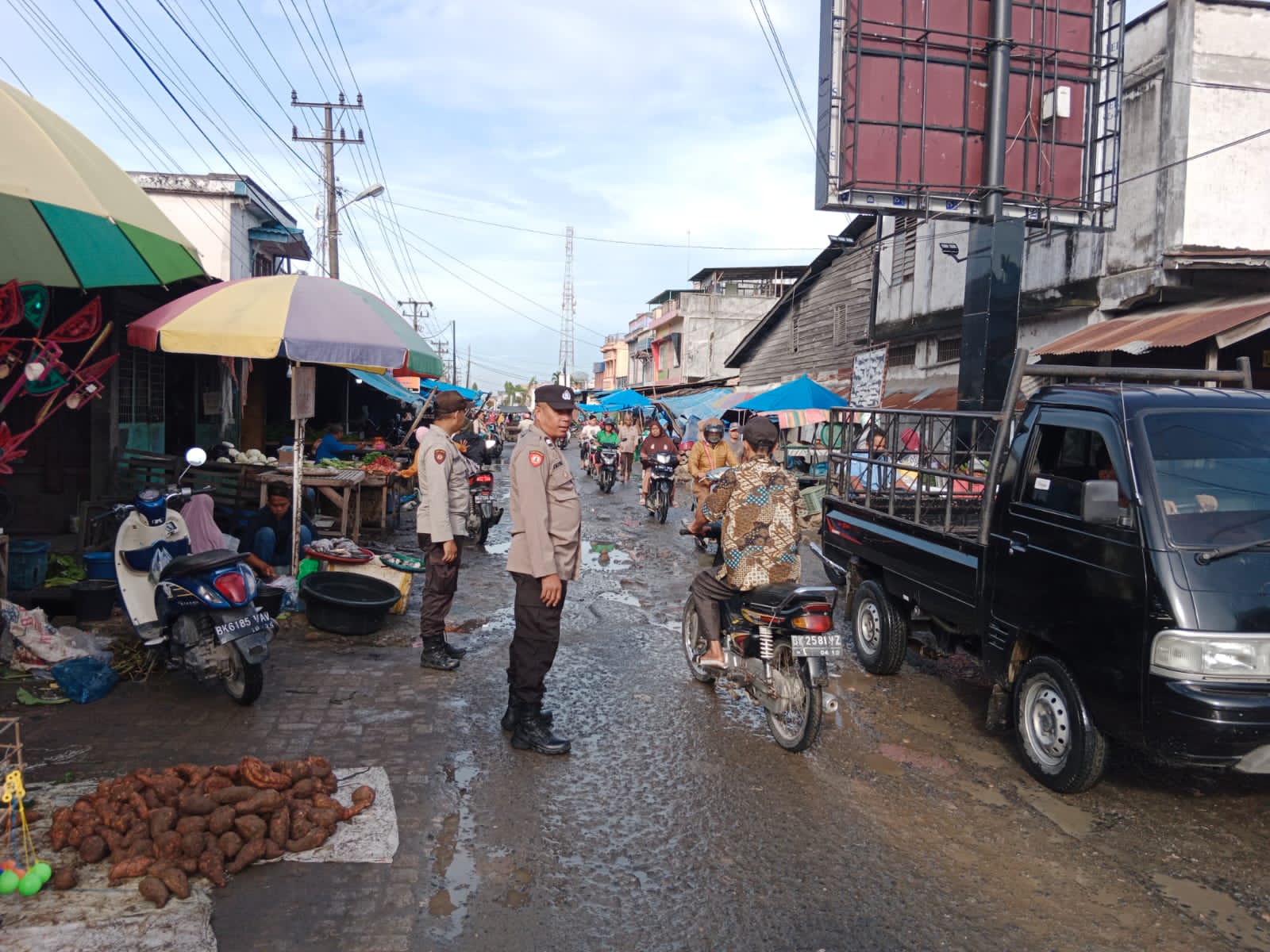 Pengaturan lalu lintas dilaksanakan oleh personel Aiptu Isriyanto, Aiptu J Matindang beserta Aiptu M Rudy S dilakukan di Pajak Pagi kebun Sayur Kelurahan Binjai Serbangan Kecamatan Air Joman Kabupaten Asahan.