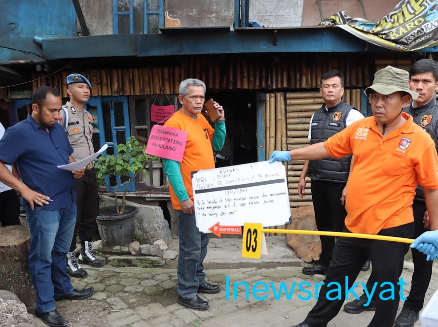 Polres Tanah Karo dan Polda Sumut menggelar rekonstruksi dalam kasus pembakaran rumah wartawan di Jalan Nabung Surbakti, Kecamatan Kabanjahe, Kabupaten Karo, Jumat (19/7) malam.