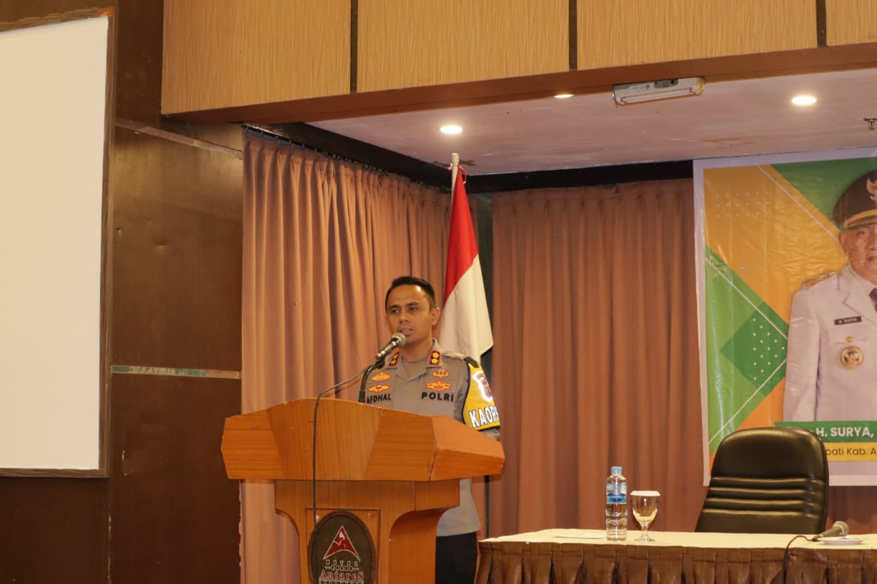 Inewsrakyat.com (Asahan) Guna mewujudkan suasana yang aman dan kondusif menjelang dan saat Pemilihan Umum (Pemilu) 2024, Kapolres Asahan AKBP Afdhal Junaidi, SIK, MM, MH yang didampingi Kasat Reskrim Polres Asahan Rianto memberikan pembekalan aparatur pemerintah desa sekabupaten Asahan, yang dilaksanakan di medan (hotel grand antares) Kamis 25/1/2024.